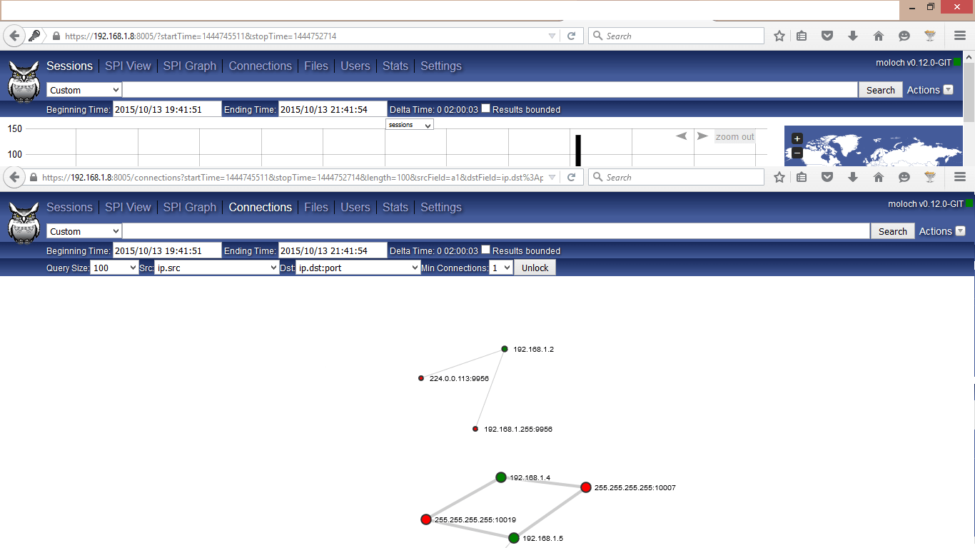 - Connection: – It shows a real time connection with internal or external IPs along with Port. Here you can further drill down your analysis to specific IP by writing MOLOCH query.